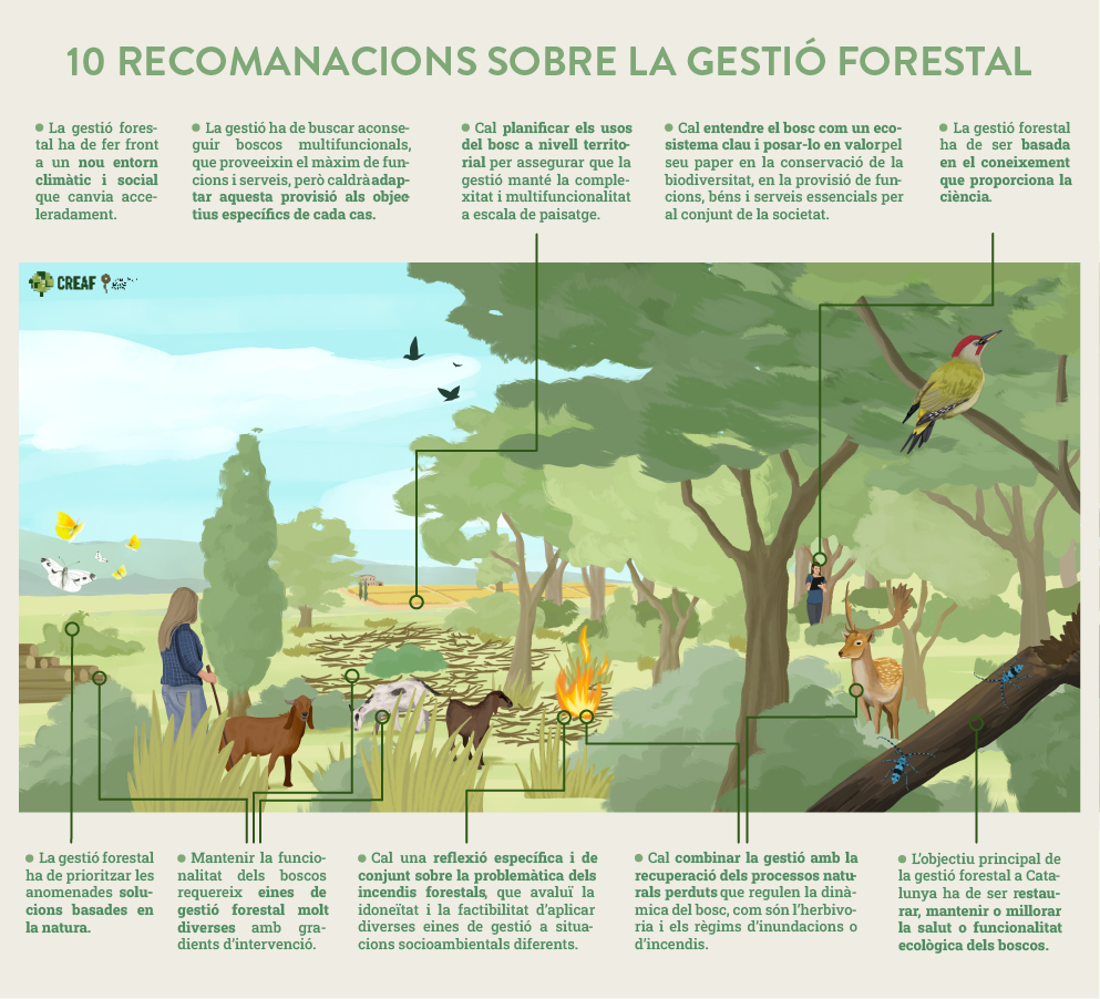 El missatge clau del decàleg és que la gestió dels boscos ha d’ acompanyar el bosc, un sistema viu i dinàmic, en tres reptes a la vegada: mantenir la biodiversitat que acull, fer-los més resilients al canvi climàtic i ajudar a que proporcionin els serveis que li demanem com a societat. En aquest sentit, el CREAF aposta per una gestió forestal basada en la ciència i consensuada amb els actors del territori. Cal trobar pràctiques de gestió que permetin un desenvolupament sostenible de la bioeconomia forestal, aprofitant els productes i serveis del bosc però sense perjudicar la salut i el seu bon funcionament. Aposta també per diversificar les pràctiques de gestió, amb nivells d’intensitat adaptats a cada lloc i a cada objectiu. I, de fet, reconeix que no intervenir (aparentment, no gestionar) també s’ha d’entendre com a gestió forestal si és una decisió planificada i amb un objectiu clar.