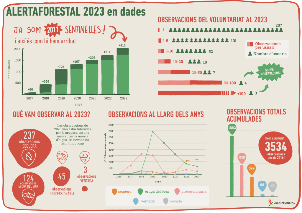 Ens impressiona molt veure tot el que hem crescut com a comunitat de voluntariat. Hem arribat als 2011 usuaris i durant 2023 vam sumar 212 sentinelles al nostre projecte! Des dels inicis no hem deixat de créixer, i això és una molt bona notícia.