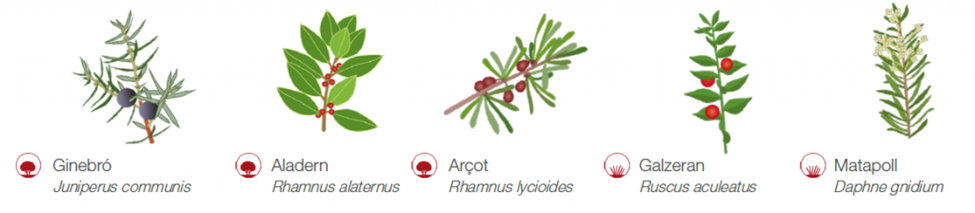 Les espècies que cal mantenir en aquestes zones són aquelles que, per un costat, conserven les fulles verdes tot l’any i tenen un contingut d’aigua més elevat i, per l'altre, presenten una estructura compacta, generen poques restes fines i necessiten més calor per encendre’s. A la vegada, per assegurar l'èxit de la franja també s'haurien de controlar la presència de totes aquelles espècies inflamables. Quines podrien ser? Les que continguin olis essencials o compostos orgànics volàtils com l‘espígol i el tomaní, o també d'altres com les estepes i els brucs.