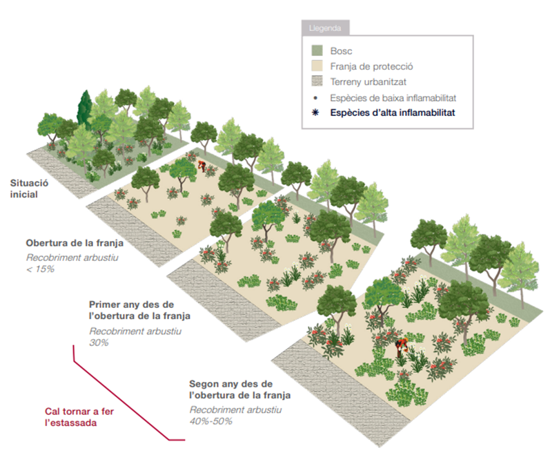 La franja ha de ser una zona de baixa combustibilitat, que no cremi amb facilitat,i ha de presentar un estrat arbustiu moderat