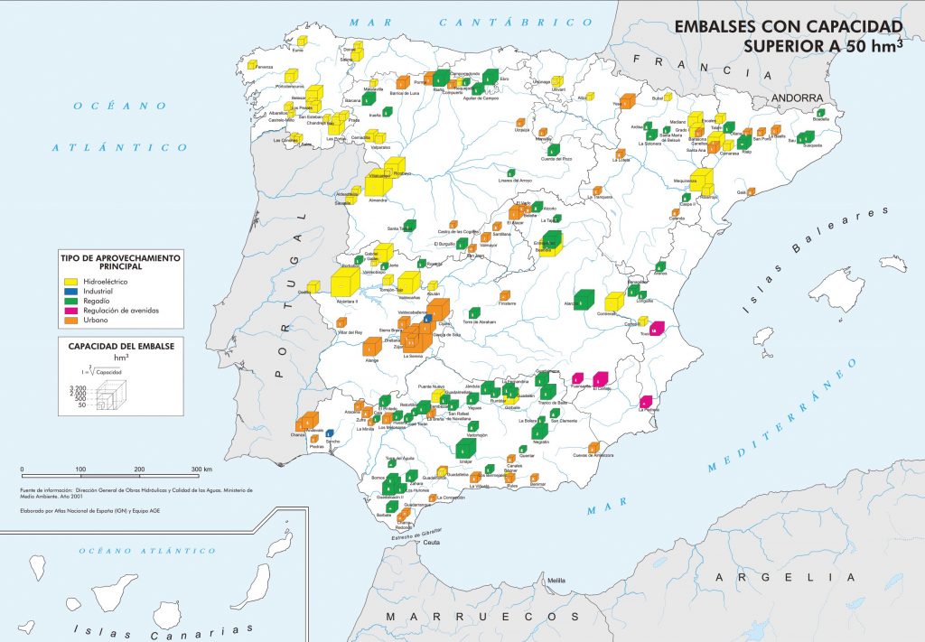 Mapa dels embassaments amb capacitat superior a hm³. Font: Instituto Geográfico Nacional.