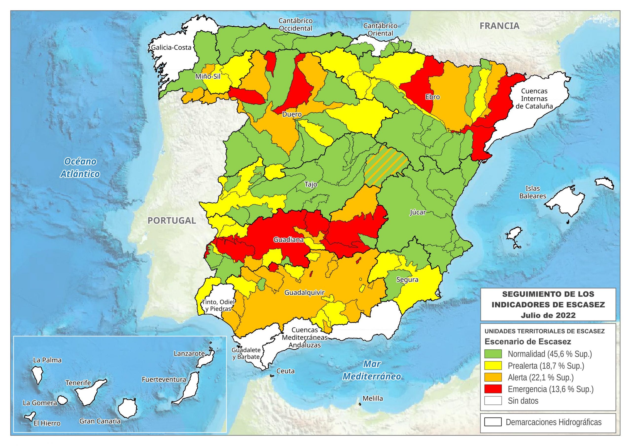 Mapa de seguiment dels indicadors d'escassetat de l'aigua de Juliol de 2022. Font: Ministerio para la Transición Ecológica y el Reto Demográfico.