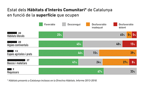 L’avaluació de l’estat de conservació dels hàbitats d’interès comunitari segueix una metodologia anàloga a la que s’ha fet servir per avaluar les espècies. En aquest cas, l’estat de conservació s’estableix a partir de l’àrea de distribució, la superfície, l’estructura i funcions i les perspectives de futur. Dels 99 hàbitats inclosos en la Directiva Hàbitats presents a Catalunya, el 58% presenta un estat de conservació desfavorable, del 18% no es disposa de prou informació i el 24% restant mostra un estat favorable.