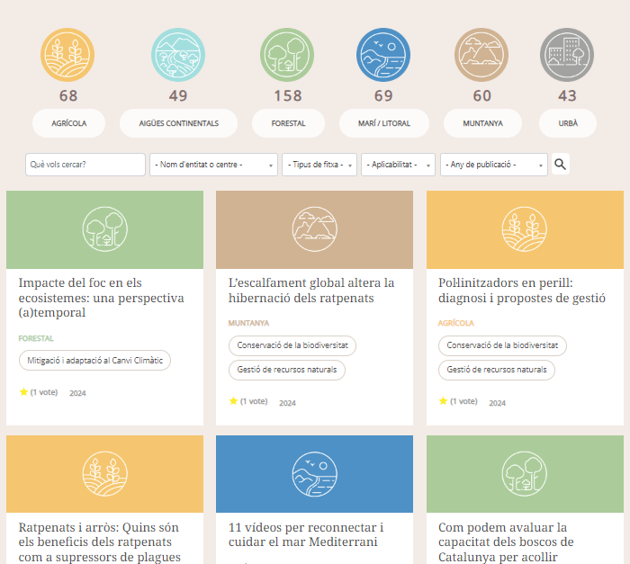 D'entrada, les fitxes s’han actualitzat de manera que la cerca és molt més refinada i precisa. Conté diversos filtres que et permeten trobar el que necessites segons els ambients (marí, urbà, forestal, aigües continentals i muntanya), l’aplicabilitat (conservació, mitigació i adaptació al canvi climàtic, educació ambiental, salut pública, restauració ambiental), l'autoria dels centres de recerca i, fins i tot, el tipus de fitxa (manual, article, web, cartografia).