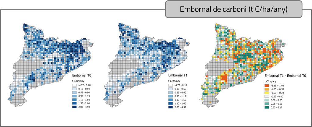 En un quart de segle, entre 1990 i 2014, els boscos de Catalunya han patit un descens generalitzat de la seva capacitat de capturar diòxid de carboni (CO2), que arriba gairebé al 17%. Així mateix, l’aigua blava, la pluja que no aprofiten les plantes i arriba als rius i aqüífers, s’ha reduït fins a un 29%.