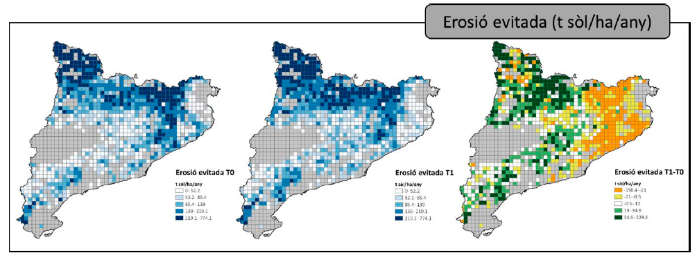 L’únic servei ecosistèmic estudiat que no ha disminuït ha estat l’erosió evitada. L’increment de superfície forestal ha fet que augmenti la quantitat de sòl que anualment no s’erosiona. Des del 1990 fins el 2014 ha augmentat gairebé un 1,6%. Els boscos mediterranis de les comarques de Girona i del nord de Barcelona són els únics que han experimentat una pèrdua d’aquesta capacitat (-11%), mentre que a la part més occidental del Pirineu i als boscos d’interior de Catalunya és on més ha crescut l’erosió evitada, un 18% i 20% respectivament.