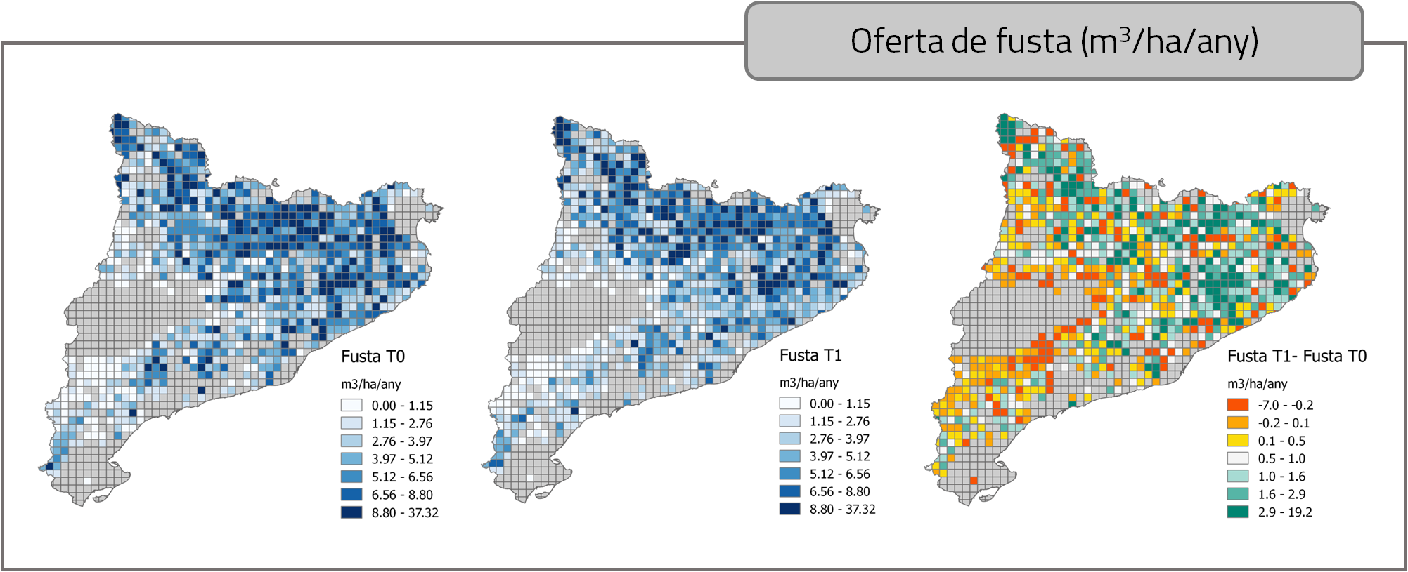 Segons el FOREStime, la fusta que es pot extraure del bosc de forma sostenible, sense comprometre els estocs de carboni, també ha disminuït al voltant del 7% durant el període analitzat. Els valors calculats en metres cúbics per hectàrea i any han patit una davallada especialment acusada als boscos d’interior (-14,5%) i als mediterranis (-8,2%), mentre que als montans només s’ha vist reduïda en un 1,2%.