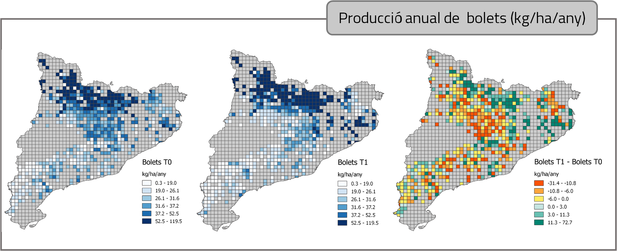 Els bolets són l’únic servei que ha mostrat més estabilitat en els 25 anys estudiats. De fet, només s’ha observat una disminució de l’1% a tot Catalunya. Si ens fixem en les diferents regions, els boscos d’interior presenten una pèrdua propera al 17%, mentre que els montans i mediterranis han incrementat la producció un 2,5% i un 3,8%, respectivament.