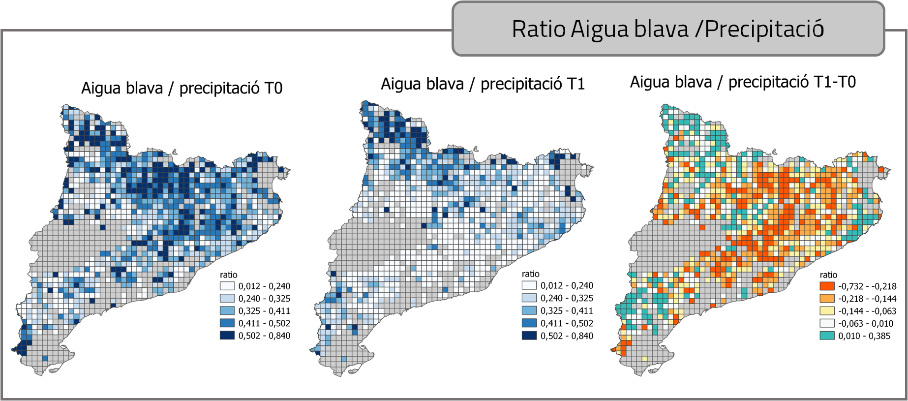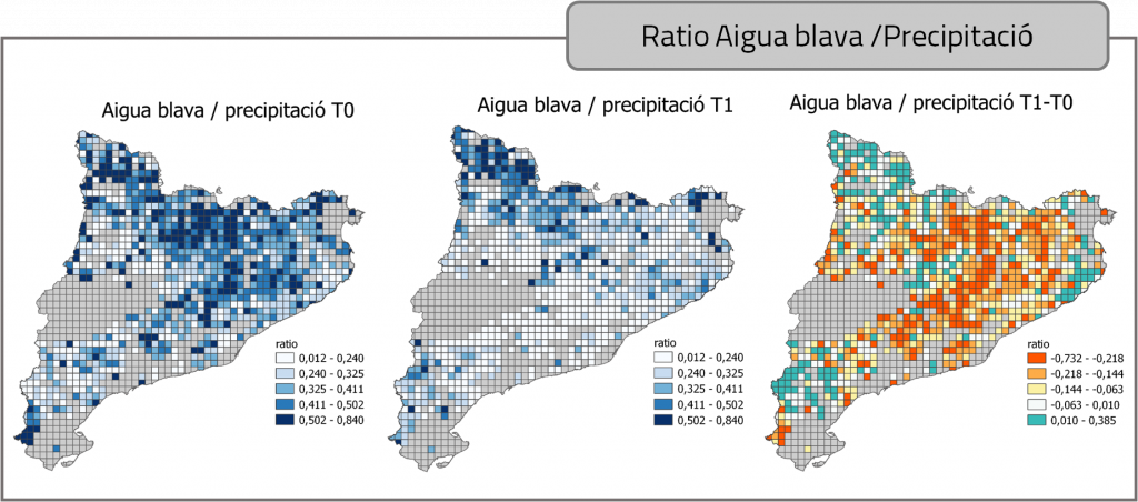 El creixement del bosc i la poca gestió forestal aplicada han provocat que l’aigua blava o d’escorrentiu sigui el servei que més ha disminuït els darrers anys, amb un descens del 29% per al conjunt del país. En els boscos d’interior la disminució arriba a més del 38% i als mediterranis, situats a les conques internes dels rius catalans, fins el 33%. A la regió dels boscos montans del Pirineu occidental, on es recull part de l’aigua en embassaments a la conca del Segre, la minva ha estat menor, del voltant del 12%. Només algunes zones de la Terra Alta, el Pallars, la Val d’Aran, l’Alt Urgell i la costa de la Selva mostren un tímid increment de la ratio.