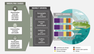 Causes subjacents, impulsors indirectes i impulsors directes de la pèrdua de biodiversitat i el declivi de la natura. Font: Informe IPBES