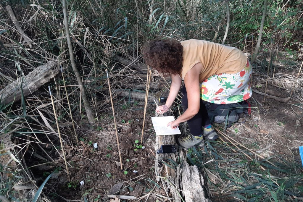 Sandra Saura, investigadora del CREAF prenent les dades als exemplars de capell d’aigua (Hydrocotyle vulgaris) acabats d’ensotar en una de les vores de la zona d’aigües permanents de l’estany de Boada. Font: Ramon Fortià.