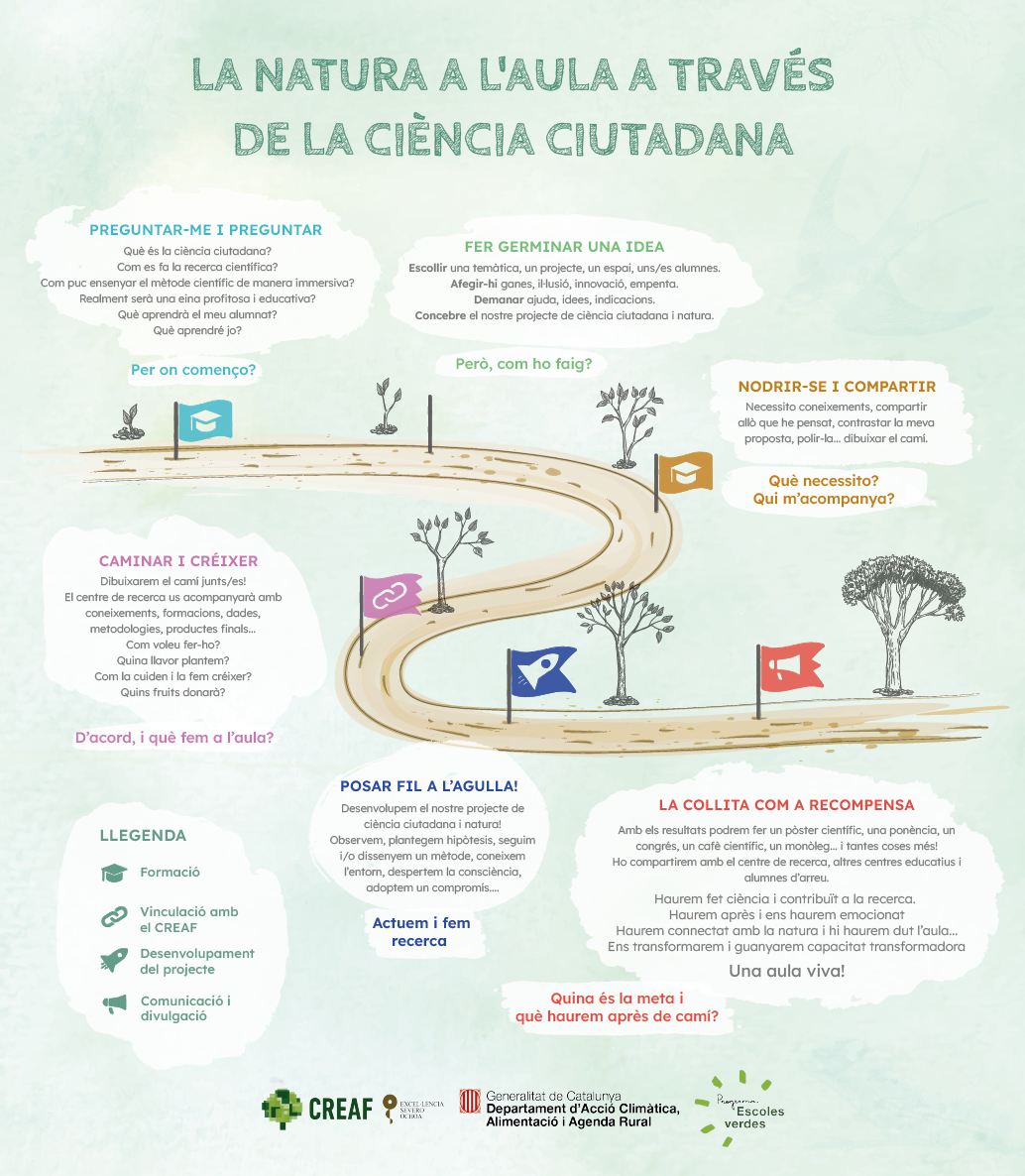 La ciència i la natura juntes, tan fonamentals i ancestrals, poden ser una eina d’innovació educativa. Aquesta és el motor del nou projecte conjunt d’innovació educativa entre el Departament d’Acció Climàtica, Alimentació i Agenda Rural de la Generalitat de Catalunya i el CREAF. Ambdues entitats inicien aquest setembre un procés d’acompanyament dirigit a les més de 800 Escoles Verdes de Catalunya que té per objectiu apropar la natura a les aules de secundària i formació professional a través de la ciència ciutadana. Per una banda, la natura, com un element d’observació, permet als alumnes fer-se preguntes i sortir dels materials i ambients escolars tancats i grisos. Per altra banda, la ciència ciutadana, amb un mètode científic immersiu, permet al professorat treballar el pensament crític i acostar la ciència al jovent. En tot el procés, els centres que participin en aquest acompanyament tindran un gran al·licient: estaran en contacte directe amb el CREAF i participaran directament en la seva recerca i resultats sobre canvi climàtic, boscos i biodiversitat.