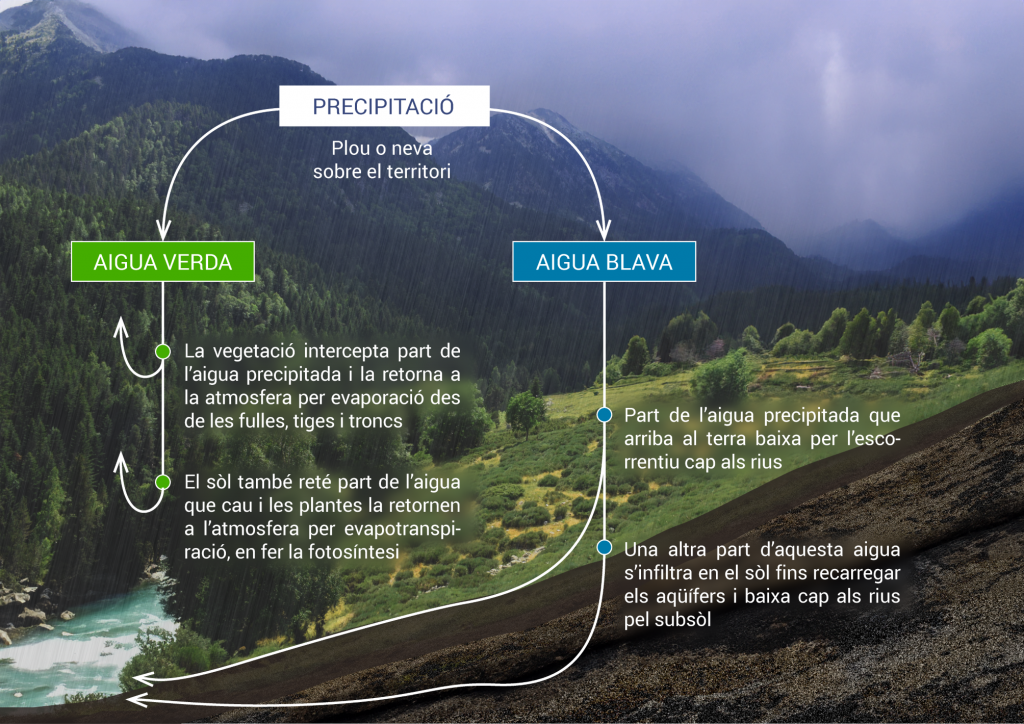 Per respondre aquestes preguntes, en primer lloc cal tenir en compte dos conceptes que descriuen aquesta relació íntima entre bosc i aigua, els conceptes de l’aigua verda i l’aigua blava. L’aigua verda és aquella part de la precipitació que cau al bosc i que acabarà retornant a l’atmosfera a través de la mateixa vegetació. Una part de l’aigua verda és la que retorna perquè les plantes l’han interceptada i s’evapora directament des de la superfície de les fulles i els troncs. L’altra part és la que queda retinguda temporalment dins del sòl i torna a l’atmosfera fonamentalment per transpiració de la vegetació, un intercanvi de gasos necessari per mantenir l’entrada de CO2 a les fulles i per tant la fotosíntesi. D’altra banda, l’aigua blava és la diferència entre la precipitació i l’aigua verda, i correspon a la part de la precipitació que no farà servir la vegetació i, per tant, que no torna a l’atmosfera, sinó que s’escorre per la superfície del terreny o s’infiltra en el sòl fins arribar als rius o als aqüífers.