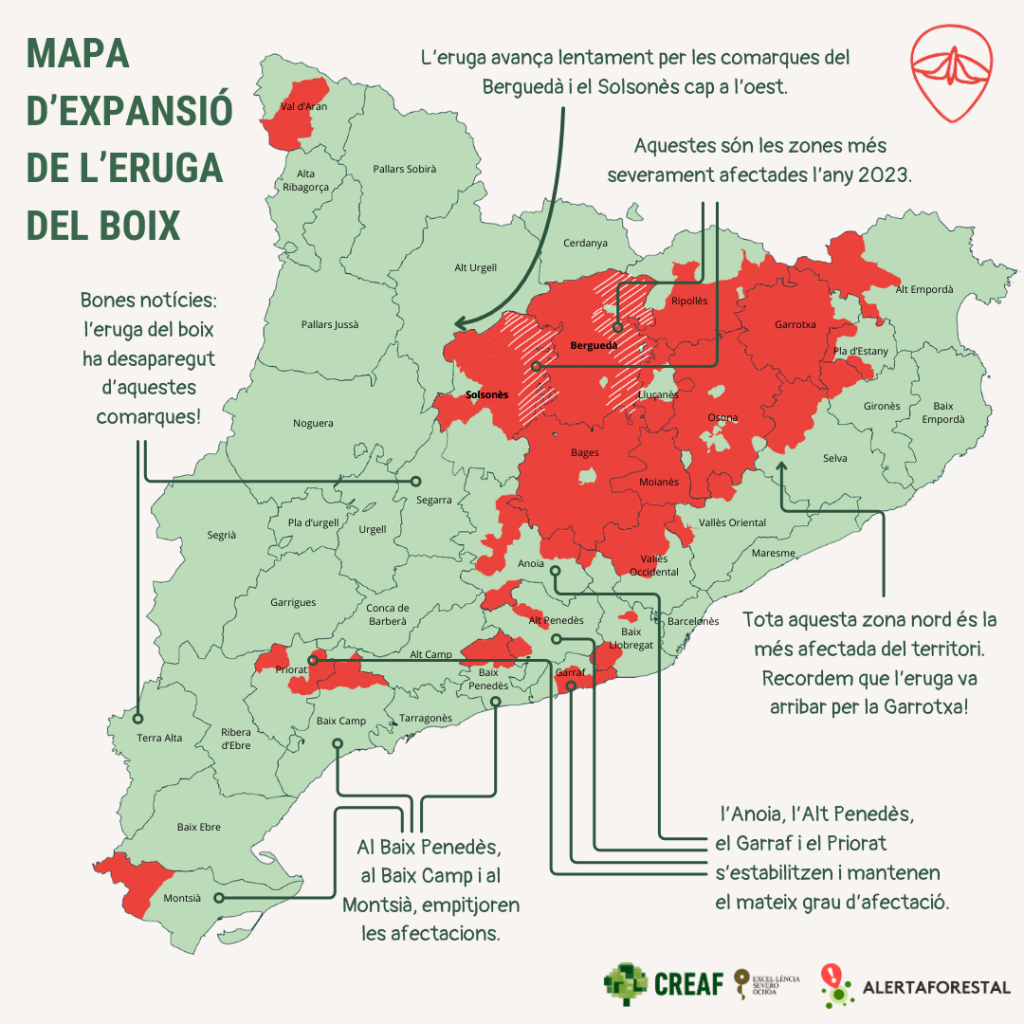 Les dades recollides pel Departament d’Acció Climàtica indiquen que l’any 2023 van augmentar les boixedes afectades tan sols un 4% respecte al 2022; en comparació amb els darrers anys que havia arribat a augmentar un 37%. Les comarques on segueixen augmentant els casos són principalment el Berguedà i el Solsonès. Des del CREAF, en fem seguiment amb el projecte de ciència ciutadana Alerta Forestal per avaluar l’estat dels boscos davant aquesta problemàtica. Durant el mes de juliol fem una crida a la ciutadania per a que ens ajudin a detectar l’impacte de l’eruga del boix, ja que aquesta és l’època on els seus efectes són més visibles, després de la primavera. Qualsevol persona pot participar-hi, només cal enviar una foto de la zona afectada i la ciència farà la resta!