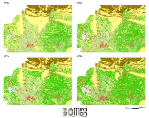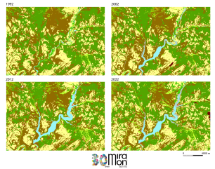 Un dels estudis més rellevants duts a terme recentment amb el MiraMon ha estat el projecte Dinàmica dels Usos i Cobertes del Sòl de Catalunya (DUCS). Es tracta d’una iniciativa, encarregada per la Generalitat de Catalunya al CREAF i al Departament de Geografia de la UAB, que permetrà conèixer com ha canviat el territori català els darrers 40 anys. Gràcies al DUCS podrem saber quins han estat els canvis d’usos del sòl de Catalunya al llarg del període de 1987 a 2022, que inclou moments molt importants quant a transformació del territori. Això ens farà saber, per exemple, quantes hectàrees de bosc s’han guanyat, quant abandonament agrari s’ha produït i quin grau d’urbanització ha patit Catalunya durant aquests anys de creixement. I, tan important com això, sabrem quan i on s’han produït aquests canvis.