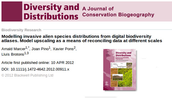 Marcer, A., Pino, J., Pons, X. & Brotons, L. 2012. Modelling invasive alien species distributions from digital biodiversity atlases. Model upscaling as a means of reconciling data at different scales. Diversity & Distributions. (accedeix a la publicació)