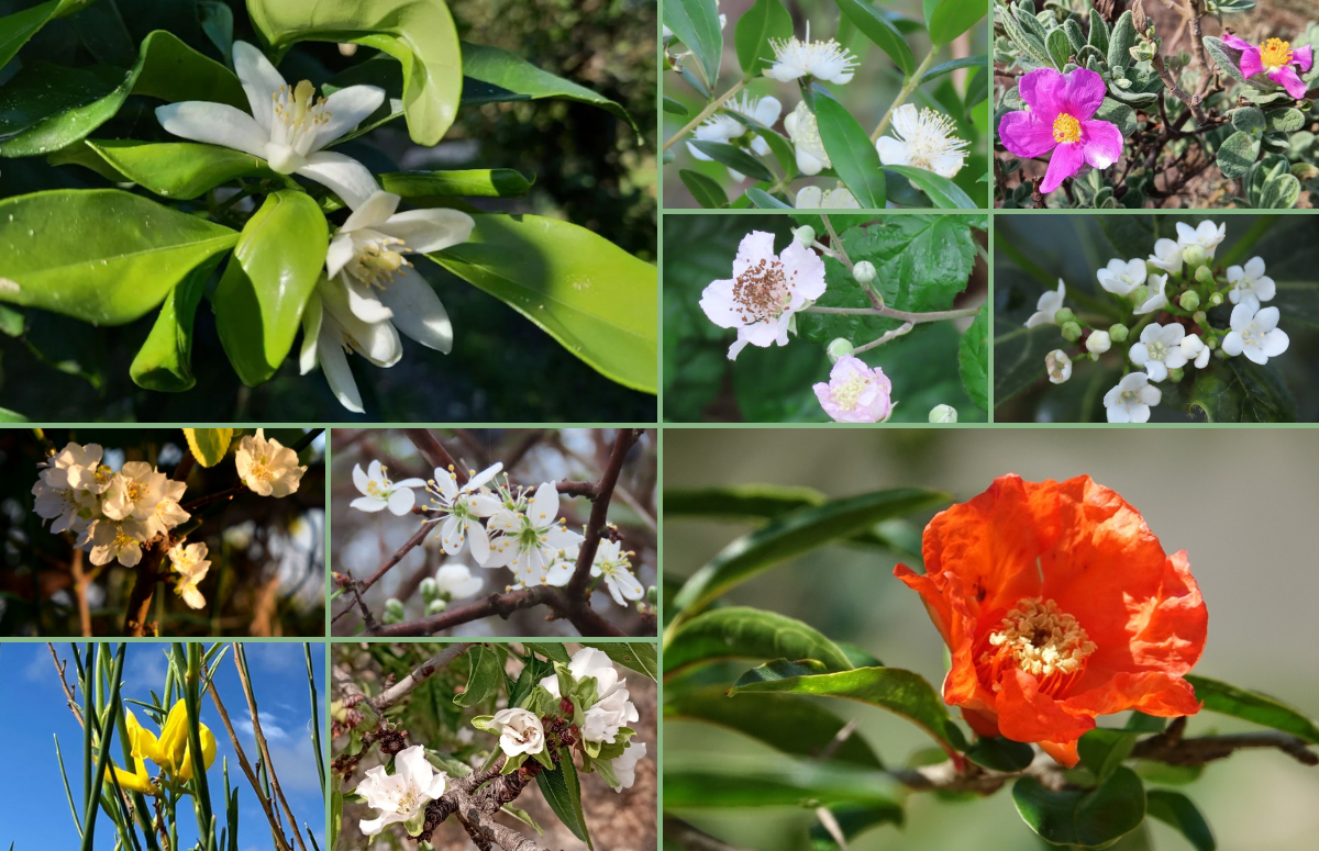 Combinació de diversos exemples de segones floracions d'aquesta tardor a Catalunya. D'esquerra a dreta i de dalt a baix, flors de taronger, murtra, estepa blanca, esbarzer, marfull, prunera, aranyoner, magraner, ginesta i ametller. Fonts: Anna M., Clàudia Fernández, Marga Losantos, Àngela Llop, Cristóbal Jiménez, Elisabeth Llopart, Bego Vendrell i Violeta Saló (Voluntariat RitmeNatura)
