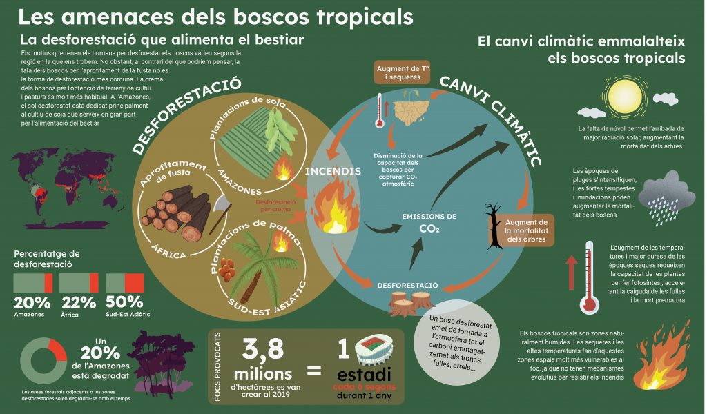 Ana Maria Yañez, investigadora de l’IDAEA i associada al CREAF, apunta que "els estocs de carboni en boscos primigenis poden arribar a acaparar el 68% de l'estoc global de carboni (Bebber and Butt, 2017). Per exemple, s'ha calculat que l'Amazones conté 150-200 bilions de tones de carboni (Nobre et al., 2016), comparat amb l'emissió de CO2 deguda a l’activitat humana el 2019 que va ser de 43.1 bilions de tones de CO2 . A més, cal tenir en compte les emissions de CO2 que produeixen els incendis forestals causats al desforestar el bosc i la disminució d’arbres capaços d'absorbir carboni arran d'aquesta desforestació. El canvi climàtic augmenta la mortalitat dels arbres i disminueix aquesta capacitat d'absorció i emmagatzematge de carboni”.