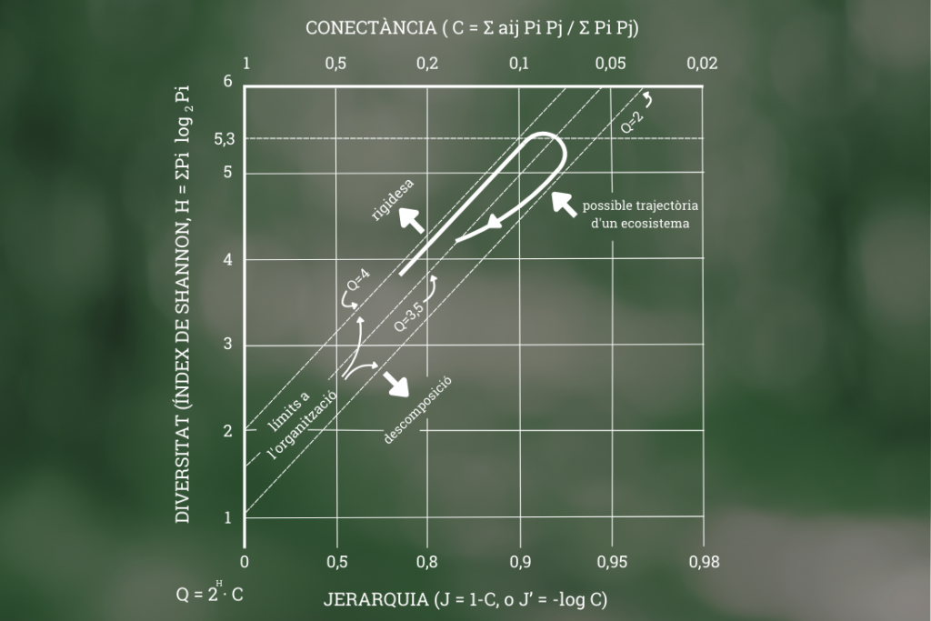 Els més coneguts d’aquests valors son el nombre d’espècies (S) i la diversitat (H, si es mesura amb l’índex de Shannon-Weaver, H= Spilog2pi, on pi es la proporció (Ni/N del total d’individus que pertanyen a l’espècie i, així que la suma de totes les pi és igual a 1. H té un valor màxim aproximat de 5.3 bits. La connectància, o connectivitat relativa, es pot expressar en relació a la connectivitat màxima possible, que és S(S-1)/2, està entre 1.6-1.8; en els ecosistemes, la connectància està limitada per l’excés de rigidesa en els valors més alts i pel risc de descomposició quan els vincles son massa escassos (vegeu figura); s’ha vist que S·C està entre 2 y 12. Margalef proposa les següents mesures: (1) jerarquia (J = 1-C), que és el complementari de la connectivitat, o sigui el nombre de vincles inexistents, i per tant expressa la formació d’una “línia de comandament”, amb valors entre 0 y 1 ; (2) equitabilitat (que es relaciona amb el nombre d’espècies S i la diversitat H per l’expressió SE = 2H) ; (3) un paràmetre Q (= C·2H = C·SE) que varia entre 2 i 4, tal com mostra la figura, emmarcant l’espai de funcionament dels ecosistemes entre la rigidesa i el risc de descomposició. S’han proposat molts altres paràmetres per descriure aspectes de les xarxes de relacions en els sistemes ecològics, socials, en xarxes neurals o de comunicacions, etc., alguns dels quals es relacionen amb la proporció d’especialistes vs. generalistes o el grau d’encaixament (parlem d’encaixament quan tant especialistes com generalistes tendeixen a interactuar amb generalistes, essent rares les interaccions entre especialistes, Bascompte et al. 2003). Sobre les relacions entre diversitat o connectància i estabilitat, hi ha força treballs amb resultats que sovint es contradiuen i es fa difícil treure conclusions generals. Per una revisió, vegeu Landi et al, 2018.