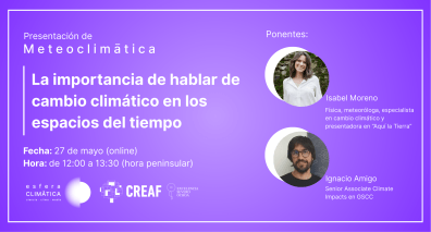 Ponentes: Isabel Moreno, meteoróloga y presentadora de ‘Aquí la Tierra’ e Ignacio Amigo, Especialista Asociado en Impactos Climáticos en GSCC.