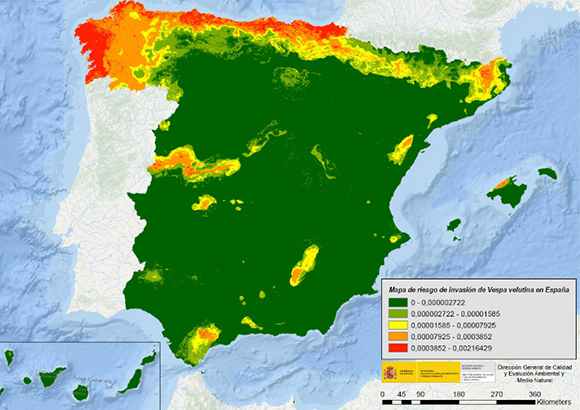 Also, an invasion risk model for Spain is already helping experts study and understand where the hornet might strike next. This model was based on a previous one created in 2014 for Navarra by Joan Pino of CREAF, and was later applied to Catalonia. Thanks to this tool, it was discovered that humid areas with mild temperatures are most favorable to colonization by the hornet, coinciding with the observation that the Northern part of the Peninsula is currently the area most occupied by the hornet. Arid areas such as Almeria or those with a dry climate such as Madrid are much less likely to be invaded. Curiously, it was also found that Vespa velutina is highly successful in colonizing urban areas.