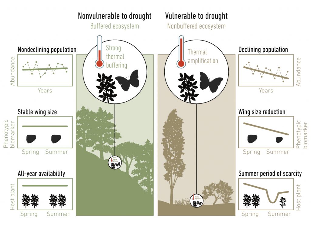 - Carnicer, J., Stefanescu, C., Vives‐Ingla, M., López, C., Cortizas, S., Wheat, C., ... & Peñuelas, J. (2019). Phenotypic biomarkers of climatic impacts on declining insect populations: A key role for decadal drought, thermal buffering and amplification effects and host plant dynamics. Journal of Animal Ecology, 88(3), 376-391.