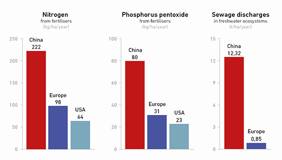 China, on the other hand, has experienced the opposite trend; the country has welcomed a large share of world’s industrial production, it doesn’t have effective environmental policies, and it continues to use fertilizers and pesticides which are rich in phosphorous. “China’s use of fertilizers amounts to three times more nitrogen and phosphorous than the United States, and two times that applied in Europe,” says Peñuelas. Also, the amount of untreated wastewater reaching river basins in China is 15 times higher than in Europe..