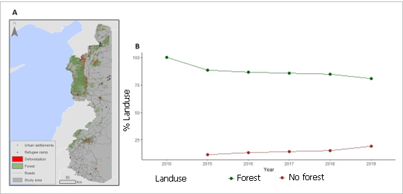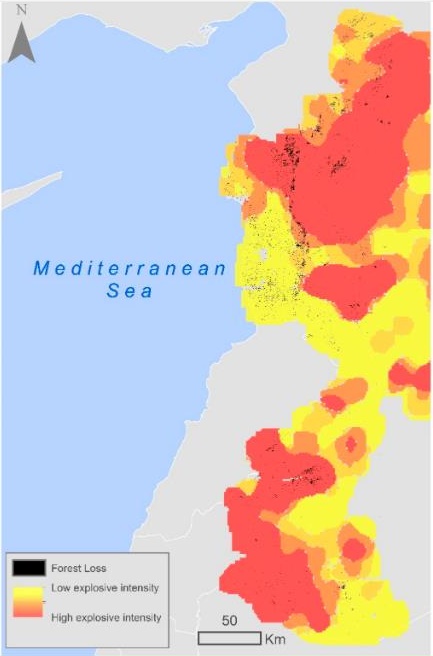 The scientific work studies in depth the relationship between deforestation and factors linked to war and weapons, such as explosions or refugee camps, since at the outbreak of the war in Syria around 1.4 million people fled to the coast, where 90% of the country's forests are located. In this sense, the difficult survival in non-urban areas and the absence of guards and suppression of environmental preservation laws generate a high dependence on forests in these situations. Thus, there are direct causes of this deforestation, where trees are cut down to obtain wood as an additional source of income and as fuel, in the form of firewood for heating and cooking. In fact, the results showed that most of the deforested areas were very close to roads, about 0.04 and 0.39 km from these roads, and that the probability of deforestation was higher in areas located closer to refugee camps. In contrast, most of the deforested areas were found to be further away from urban areas, between 12.6 and 30 Km. This is because roads facilitate connectivity and access to forest resources for sale in local timber markets and urban settlements, and in the case of refugee camps, wood is a key element for heating and cooking.