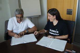 Momento de la firma del nuevo convenio entre el CREAF y la Fundación Ferrer Green for Good con Joan Pino, director del CREAF, y Estefania Rico, Directora de Socialización de la Riqueza de las Fundaciones Ferrer.