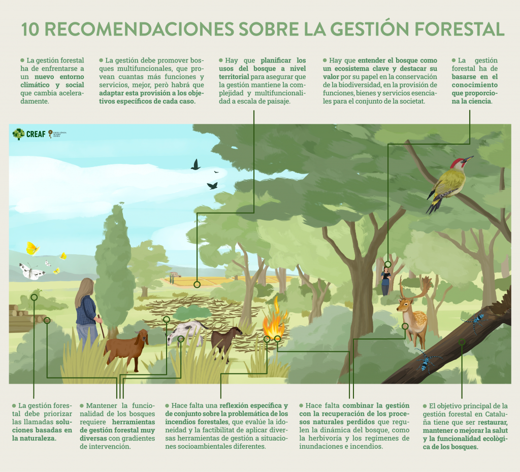Las 10 recomendaciones recuerdan que Catalunya tiene una gran diversidad de paisaje y bosques. Cada bosque se encuentra en un estado, en un contexto climático, topográfico, socioeconómico e histórico distinto. En esta realidad, es recomendable que la gestión tenga en cuenta las funciones que deseamos restaurar, mantener o mejorar según cada territorio o paisaje. No podemos esperar todo del bosque en todas partes.