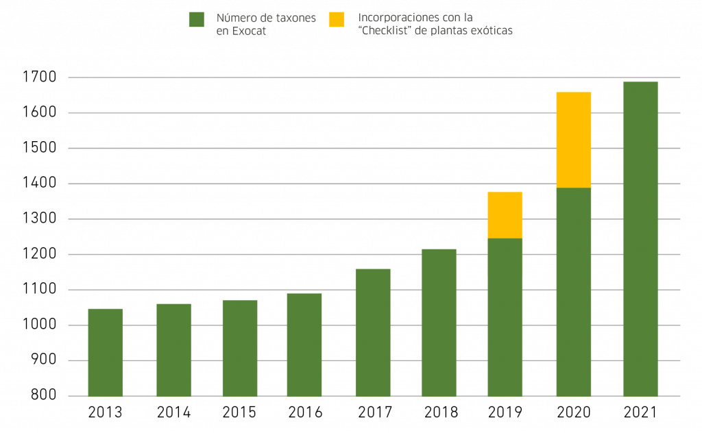 Del 2012 al 2021 trobem 631 noves espècies exòtiques a Catalunya, de les que 510 són plantes, 43 invertebrats terrestres, 35 invertebrats aquàtics i 28 ocells.