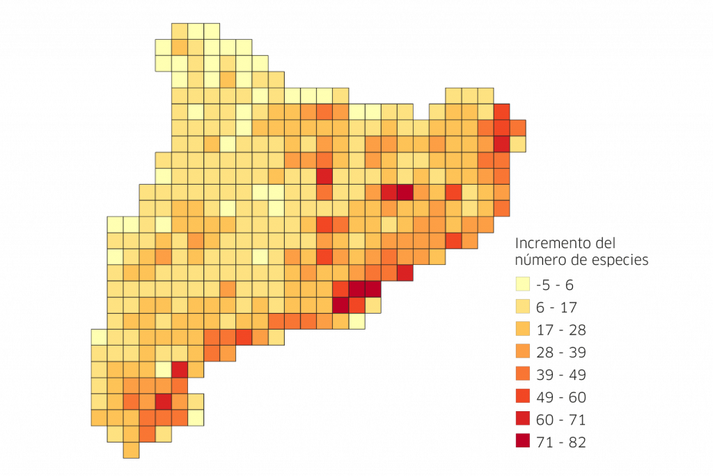 En este informe EXOCAT, se observa cómo el mayor incremento de exóticas se concentra en toda la línea litoral y en algunos sectores del centro (Bages y Osona), del norte (Gironès) y del sur (Baix Ebre) de Cataluña . Mientras el incremento observado en los puntos interiores del centro y norte de Cataluña son probablemente debidos a una mejora del conocimiento, el observado en la línea litoral y en el Baix Ebre, donde el grado de prospección ha sido continuo a lo largo del tiempo, es claramente consecuencia de que el proceso de invasión se ha ido expandiendo.