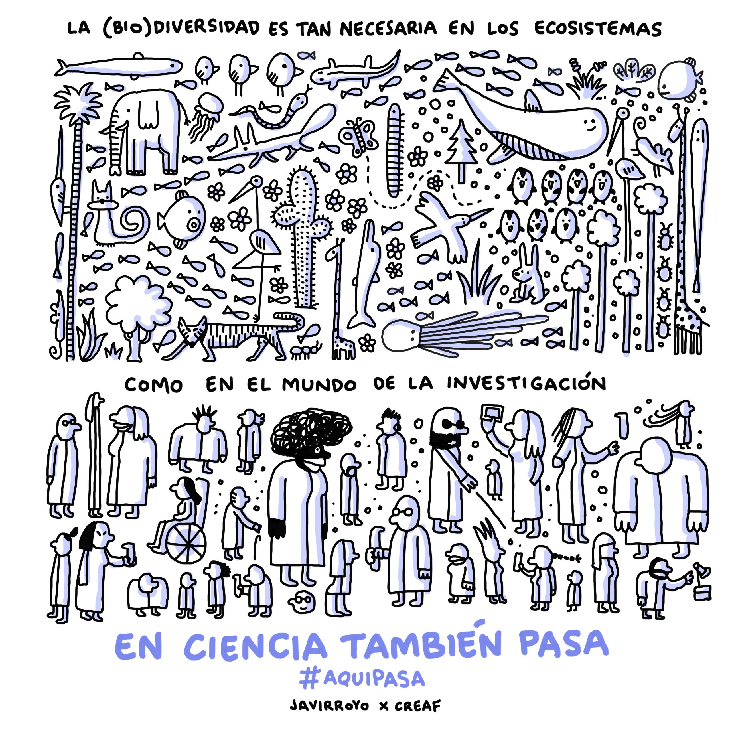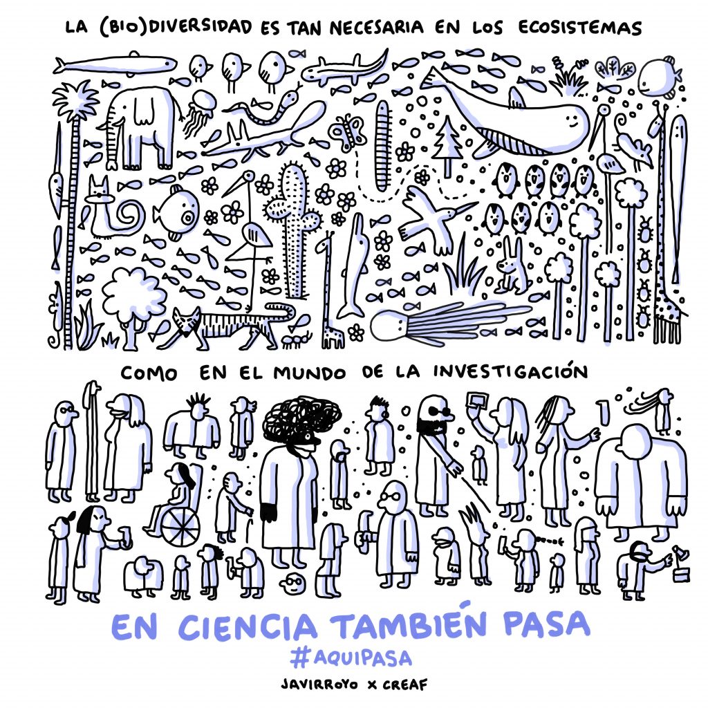 Por último, el CREAF, como centro de investigación en ecología terrestre, cambio global, observación de la Tierra y biodiversidad, acompaña la colección con una ilustración final que reivindica la necesidad y las ventajas de tener un sistema lo más diverso posible. En todas las viñetas anteriores, #aquipasa pone en evidencia la hostilidad de un sistema científico productivista, cargado de prejuicios y que no abraza ni promueve la diversidad de perfiles científicos que existen. “Como ecólogas lo tenemos muy claro, la biodiversidad es clave para mantener una naturaleza fuerte y resiliente. A pesar de esto, no vemos que se aplique esta lógica en las personas que hacen ciencia”, comenta Teresa Rosas, responsable de talento y género del CREAF. “Igual que para mantener una gran riqueza de especies en un ecosistema, hay que crear condiciones favorables para su supervivencia, necesitamos tomar medidas urgentes en el entorno científico para que aumente su diversidad; esto pasa por crear ambientes de trabajo inclusivos donde la mitad de la población también se sienta bienvenida”, concluye.