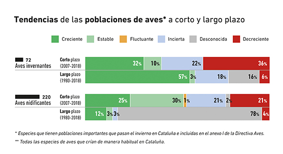Se han estudiado las especies de aves invernantes y las de aves nidificantes, las que se reproducen en Cataluña, que son el grupo del que se dispone de más información. Los primeros datos se empezaron a recopilar en 1980, pero la mayoría de los seguimientos regulares de las aves nidificantes se iniciaron a principios de la década del 2000. El análisis de los datos más recientes pone de manifiesto que, desde 2007, ha disminuido el área de distribución de al menos el 30% de las especies que se reproducen en nuestro territorio. En cuanto a los invernantes, más de la mitad de las especies (57%) han aumentado sus poblaciones desde 1980 si bien, desde 2007, un 36% vuelve a reducir su población.