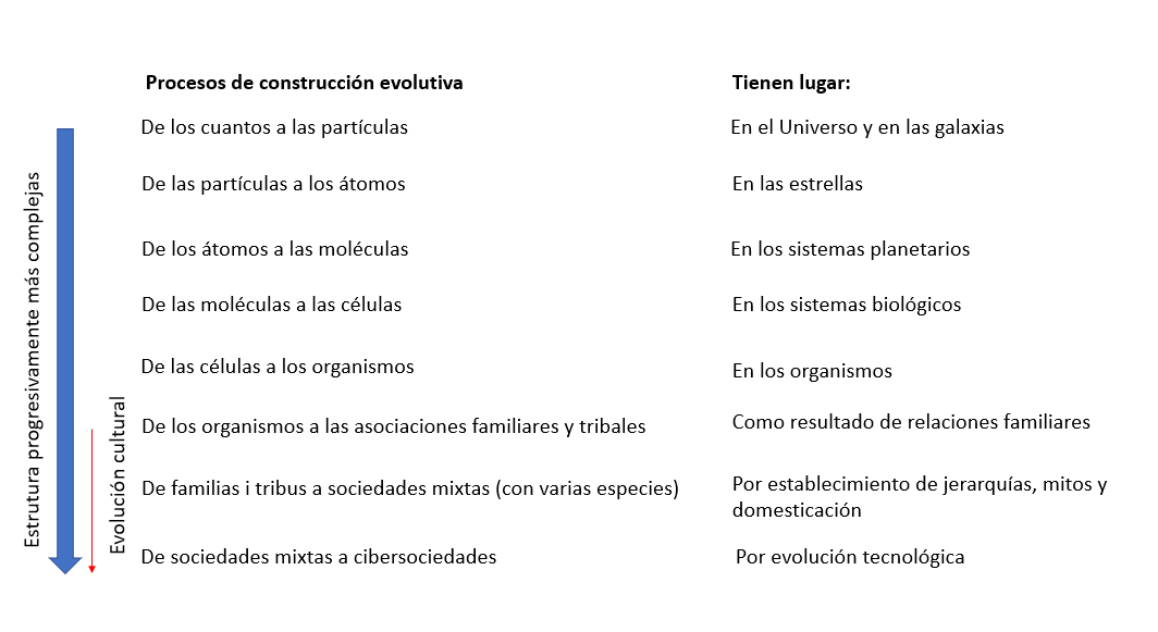 En el universo, la materia tiende a auto-organizarse. Las partículas no evolucionan para formar átomos, sino que los forman por combinación de partículas menores: los átomos son configuraciones de materia que emergen como nuevas totalidades, con propiedades que no están contenidas en las partículas que los componen. Las posibilidades son limitadas, por lo que no hay un número infinito de átomos diferentes sino sólo los que figuran en la tabla periódica, el establecimiento de la cual por Mendeleyev hace un siglo y medio es uno de los hitos mayores de la historia de la ciencia. El paso de un elemento a otro tiene lugar por adición o supresión de protones, es decir por cantidades discretas, discontinuas. Los átomos no evolucionan para formar moléculas: estos son agregados o combinaciones de átomos, como las palabras lo son de letras. No hay límite en el número de moléculas que se pueden formar a partir de los ciento y tantos átomos posibles, como no lo hay en el número de palabras que se pueden formar con las pocas letras del alfabeto. Las moléculas se combinan entre ellas en procesos que conocemos como reacciones químicas, en interacción con las condiciones del entorno y a veces con otras moléculas que actúan como facilitadoras (enzimas). Las moléculas son, también ellas, totalidades emergentes, con propiedades que no están contenidas en los átomos que las forman. Algunas moléculas pueden hacer copias de sí mismas, como resultado de la interacción con otras moléculas y con las condiciones del entorno. Es el caso de los RNAs y DNAs. Estas moléculas auto-replicativas tienen un papel especial en la vida.