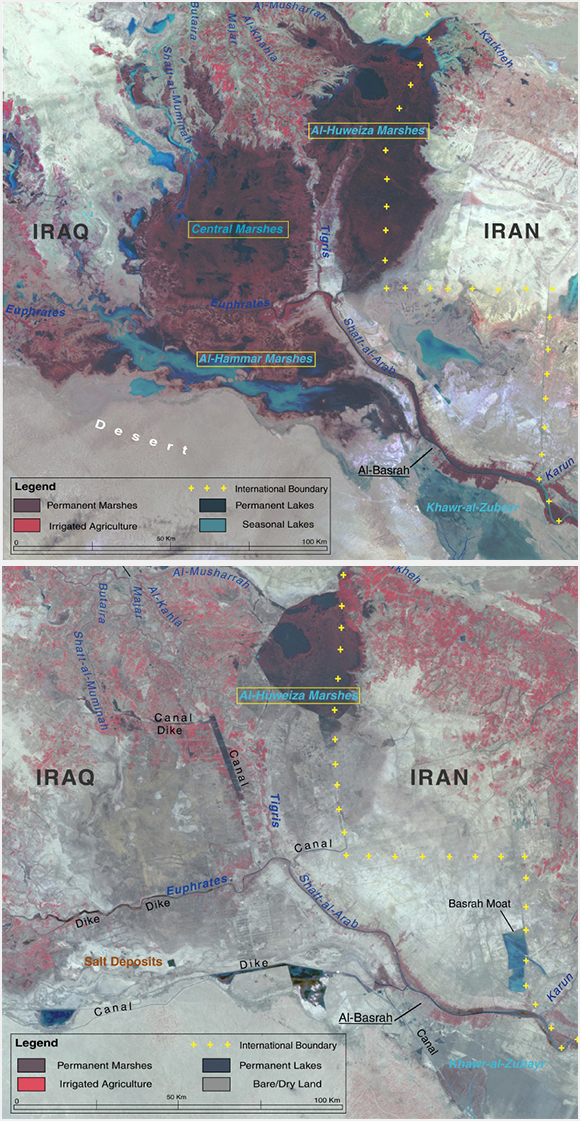 La imagen inferior, del 2000, muestra una región mucho más árida, con canales y diques, donde sólo quedan los humedales de al-Huweiza. Fuente: Partow, H. (2001)