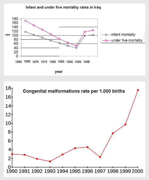 El gráfico inferior muestra, por cada 1.000 nacimientos, la tasa de malformaciones congénitas observadas en el Hospital Universitario de Básora. Fuente: Wikipedia