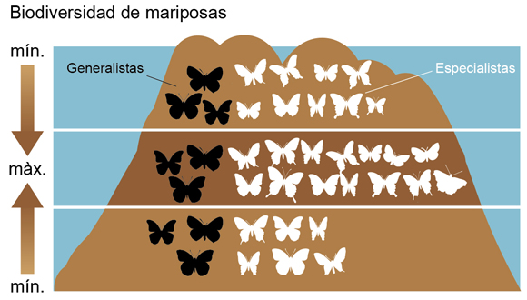 Así, se ha visto que las mariposas más generalistas (aquellas que toleran un rango de temperaturas y sequía amplios, tienen una dieta variada y puede volar bastante lejos) se distribuyen en un rango amplio de altitudes y, además, las poblaciones de diferentes lugares se parecen mucho genéticamente. En cambio, las mariposas más especialistas (las que no toleran bien la sequía o los cambios de temperatura, se alimentan de pocas especies de plantas y no suelen volar muy lejos), se encuentran sobretodo en lugares de alta diversidad de especies (localizados en la montaña media y alta) y sus poblaciones son bastante distintas desde el punto de vista genético.
