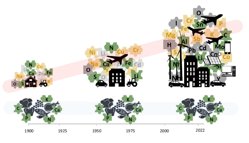 A lo largo del siglo XX, el elementoma humano ha ganado elementos de la tabla periódica, usados en la construcción, el transporte, la industria y, más recientemente, en las nuevas tecnologías, como, los dispositivos de computación, los fotovoltaicos y los teléfonos móviles. Estos elementos incluyen el silicio, el níquel, el cobre, el cromo, el oro y otros mucho menos frecuentes como el samario, el iterbio, el itrio, el neodimio, etc. En las dos últimas décadas, el uso de estos elementos escasos se ha incrementado para implementar y expandir el uso de las nuevas tecnologías y las fuentes de energía limpias.