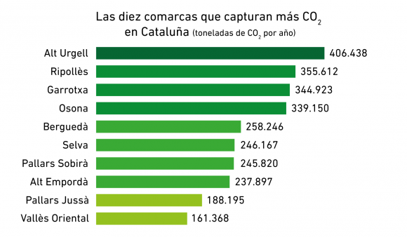 En este sentido, la información se puede calcular también por comarcas y ver, por ejemplo, cuáles son las 10 comarcas catalanas que más CO2 absorben cada año gracias a sus bosques. Alt Urgell, Ripollès, Garrotxa, Osona y Berguedà encabezan esta lista con valores que van entre las 258.000 toneladas del Berguedà y las 406.000 toneladas del Alt Urgell.