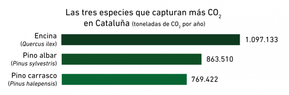 Los coordinadores del Laboratorio del CREAF y del CTFC han podido comprobar también que las encinas son la especie que más contribuye a la absorción de CO2 en Cataluña, con algo más de un millón de toneladas de CO2 cada año, seguida por el pino rojo, con 860.000 toneladas y el pino blanco, con 770.000 toneladas.