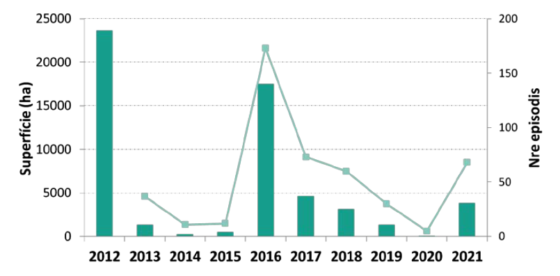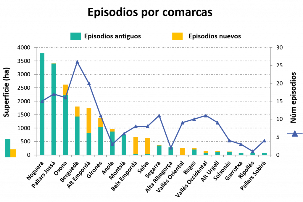 A nivel territorial, las comarcas con más superficie afectada son la Noguera y el Pallars Jussà con más de 3.000 hectáreas afectadas en cada una, aunque no se han registrado nuevas afectaciones durante este 2021. Les siguen Osona, el Berguedà y el Alt Empordà, que sí que tienen más superficie afectada que en años anteriores. Algunas comarcas que hacía tiempo que no tenían episodios de decaimiento forestal, como el Vallès Oriental, u otras que ya habían conseguido recuperar los bosques afectados anteriormente, como es el caso de la Selva o el Baix Empordà, han registrado centenares de nuevas hectáreas de decaimiento. Así pues, se observa como la mayoría de nuevos episodios de sequía se encuentran en las regiones noreste del país. Destacan las más de 1.500 hectáreas de nueva afectación entre las dos comarcas ampurdanesas, las cuales representan un 40% de la superficie de nueva afectación en toda Cataluña. En el sentido contrario tenemos comarcas como el Priorat, la Ribera d’Ebre, la Terra Alta o la Conca de Barberà que no han registrado ningún episodio nuevo de decaimiento forestal. En cuanto a la superficie de bosque afectado destaca el Montsià (9,3% de superficie forestal afectada), seguida del Pallars Jussà y el Gironès. Después de este año de sequía, el porcentaje de bosque afectado por decaimiento en Cataluña pasa del 0,77 al 1,46.
