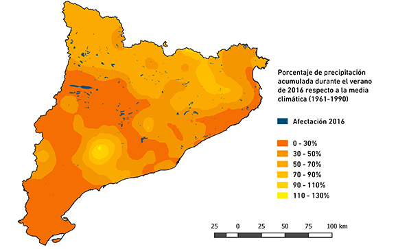 Casi un 60% de las zonas forestales afectadas por la sequía corresponden a afectaciones nuevas del año 2016. Cerca del 75% de los bosques que se han visto afectados se encuentran en zonas donde llovió menos de la mitad de lo habitual. El Pallars Jussà, Anoia y la Alta Ribagorça son las comarcas más afectadas. Por especies, los robles y las encinas son los más perjudicados.