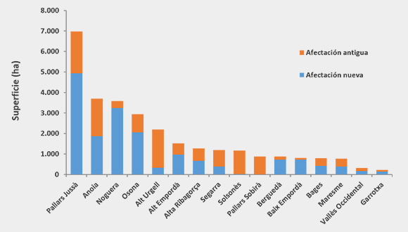 Por comarcas, el Pallars Jussà (7.000 ha), Anoia (3.700 ha) y la Noguera (3.600 ha) son las que presentan una mayor superficie de bosque afectada. Y especialmente la sierra del Montsec, entre el Pallars Jussà y la Noguera, se encuentra bastante afectada.