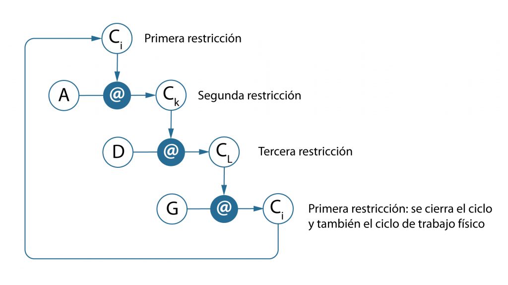 Montévil y Mossio (2015) han propuesto una nueva teoría, llamada del triple cierre. Es demasiado compleja para dar aquí una idea clara de ella. Todo proceso biológico es un proceso de trabajo físico lejos del equilibrio, que tiene como inputs para crear sus productos los estímulos y restricciones del entorno. Lo que hace la teoría es proponer una caracterización conceptual y formal de la organización biológica basada en el cierre de restricciones: cada restricción depende de, y contribuye a, mantener las demás (véase la siguiente figura). Observamos que intervienen dos regímenes causales: 1) los procesos, que tienen lugar en condiciones termodinámicas abiertas fuera del equilibrio, tales como las reacciones químicas dentro de las células; y 2) las restricciones, entidades que actúan sobre los procesos pero cambian muy poco a escalas temporales relevantes (un enzima, por ejemplo, condiciona una reacción química, pero él no cambia; la membrana de la célula también favorece los procesos en su interior sin cambiar ella, al menos en un tiempo muy largo comparado con el de las reacciones).