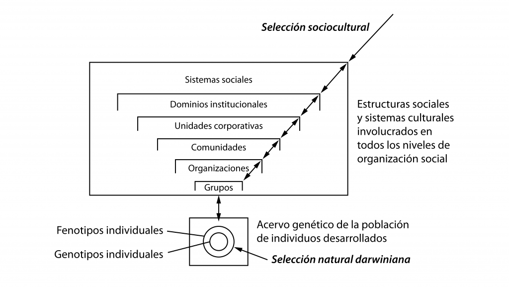 Lo que hemos dicho se aplica también a la evolución cultural, en la que la emergencia de nuevas entidades (por ejemplo, un nuevo comportamiento de una especie que implica el uso de una herramienta) resulta de la transmisión de información no por vía genética sino por aprendizaje, y cada nueva entidad interactúa con las preexistentes (por ejemplo, la herramienta permite cambiar hábitos de alimentación y quizás una nueva división del trabajo entre los individuos de un grupo).