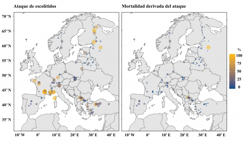 Durante estos últimos años, los bosques de coníferas de Europa que han muerto directamente o por causas asociadas a los ataques de insectos ha aumentado preocupantemente. Por este motivo, este estudio liderado por el CREAF y la Universitat Autònoma de Barcelona (UAB), ha investigado 130 parcelas en toda Europa monitoreadas desde el 2010 para entender cómo responden los árboles al insecto atacante y cuáles son los más expuestos.