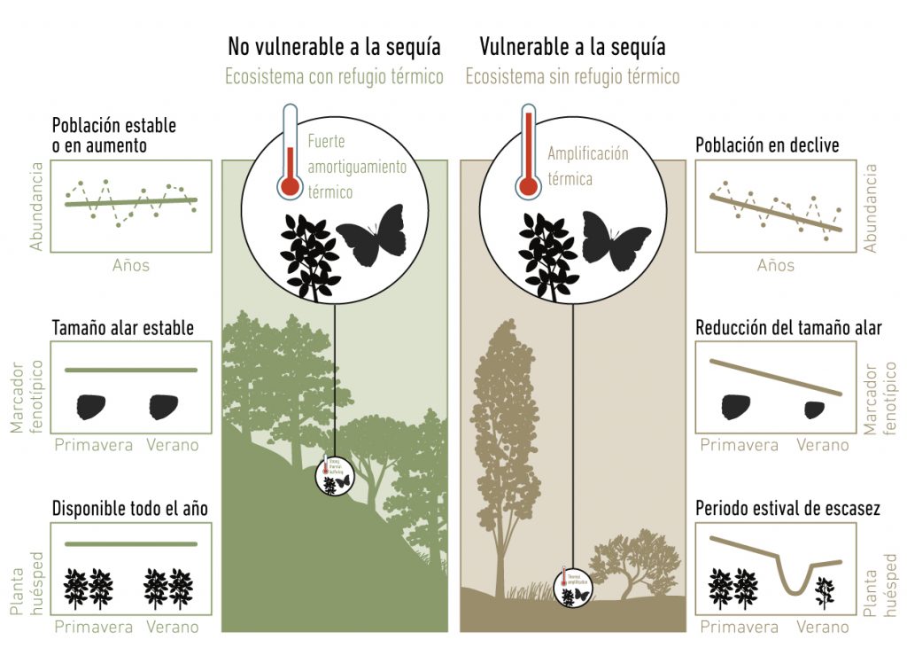El primer artículo, publicado en la revista Journal of Animal Ecology, junto con los investigadores Constanti Stefanescu y Maria Vives-Ingla, concluye que la sequía y la carencia de refugios climáticos son las culpables del descenso de mariposas que los espacios abiertos han vivido los últimos treinta años en el Mediterráneo. Los datos demuestran que las zonas naturales con refugios climáticos, como La Fageda d'en Jordà (Olot, Girona), mantienen las poblaciones de mariposas más estables. Esto se debe a que, bajo las copas de las hayas, se sostienen temperaturas 5 ºC inferiores a las del ambiente, así se mantiene la vegetación más hidratada, más capaz de disipar calor y con hojas de mayor calidad, lo que protege la comida y la supervivencia de las larvas de estos insectos durante las sequías y los calores estivales. En cambio, en zonas abiertas sin microclimas, como las zonas costeras del Delta del Llobregat y los Aiguamolls del Empordà (Girona), las larvas de los insectos crecen bajo condiciones térmicas estresantes ya menudo también con alimentos de mala calidad. Esto hace disminuir el tamaño corporal de los insectos, acorta sus alas a medida que avanza el calor del verano y pone en riesgo la supervivencia de las mariposas.