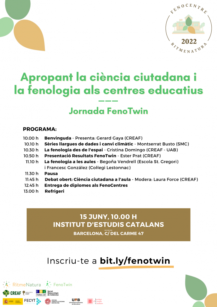 El próximo miércoles 15 de junio por la mañana tendrá lugar en el Instituto de Estudios Catalanes de Barcelona la jornada final del proyecto FenoTwin, titulada “Acercando la ciencia ciudadana y la fenología a los centros educativos”. Los protagonistas de esta sesión serán los y las docentes, ya que explicarán su experiencia con la ciencia ciudadana y tendrán voz en un debate abierto con todo el público asistente sobre cómo la ciencia ciudadana puede ayudar a las escuelas a entender y sumarse en la lucha contra el cambio climático.