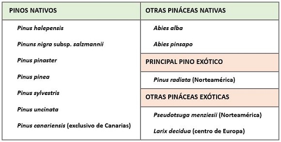 Lista de especies nativas y principales especies exóticas de la familia de los pinos en la península Ibérica y Canarias.